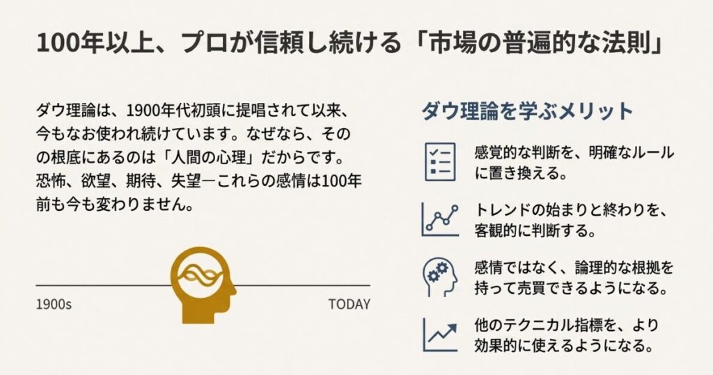 株式市場を動かしているのは、結局のところ私たち人間です。恐怖や欲望、期待や失望といった感情は、100年前も今も変わりません。ダウ理論は、そうした人間心理の集合体である「トレンド」の本質を捉えているため、時代が変わっても色あせない普遍的な価値を持っているのです。
