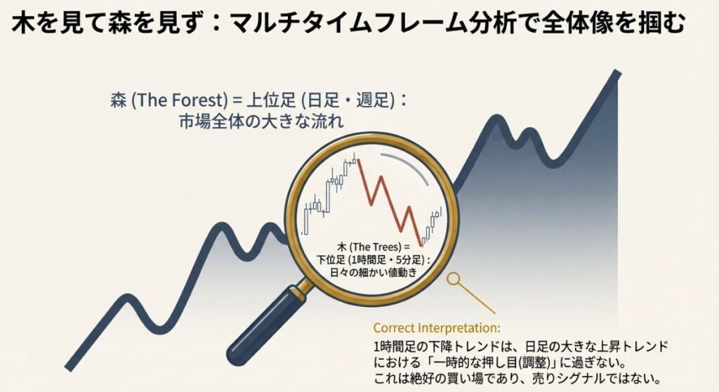 - 間違った判断:15分足だけ見て「下降トレンドだ!」と売ってしまう
