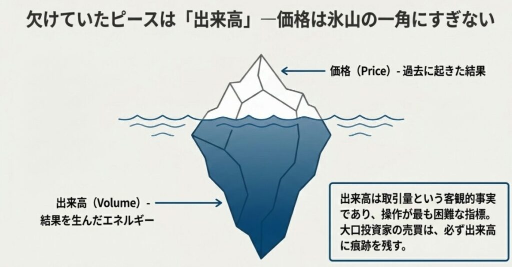 出来高は取引量という客観的事実であり、価格のように容易に操作できない指標です。大口投資家の売買は取引規模が大きいため、必ず出来高の変化として記録されます。価格だけを見ていては、その値動きが「本物」なのか「ダマシ」なのかを判断できません。
