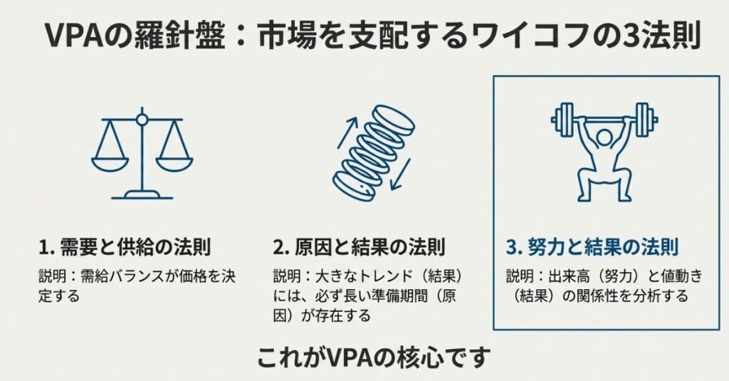 VPA分析の理論的基盤は、リチャード・ワイコフが提唱した3つの市場法則にあります。