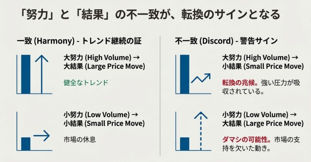 ✓ 努力(出来高)と結果(値動き)の乖離が異常を示す
