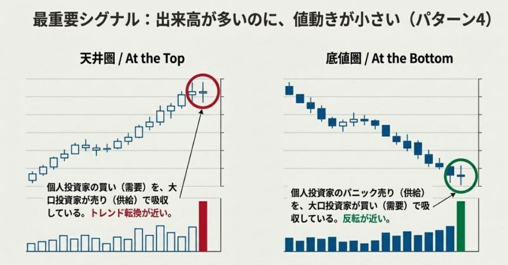 ✓ パターン4(高出来高 + 小値動き)が転換の最重要サイン
