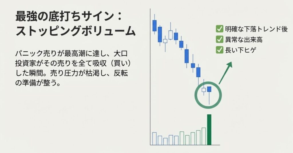 | ストッピングボリューム | 下落終盤で出現する高出来高 + 長い下ヒゲのパターン。底打ちサイン。 |