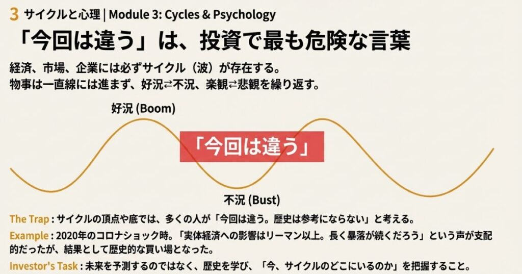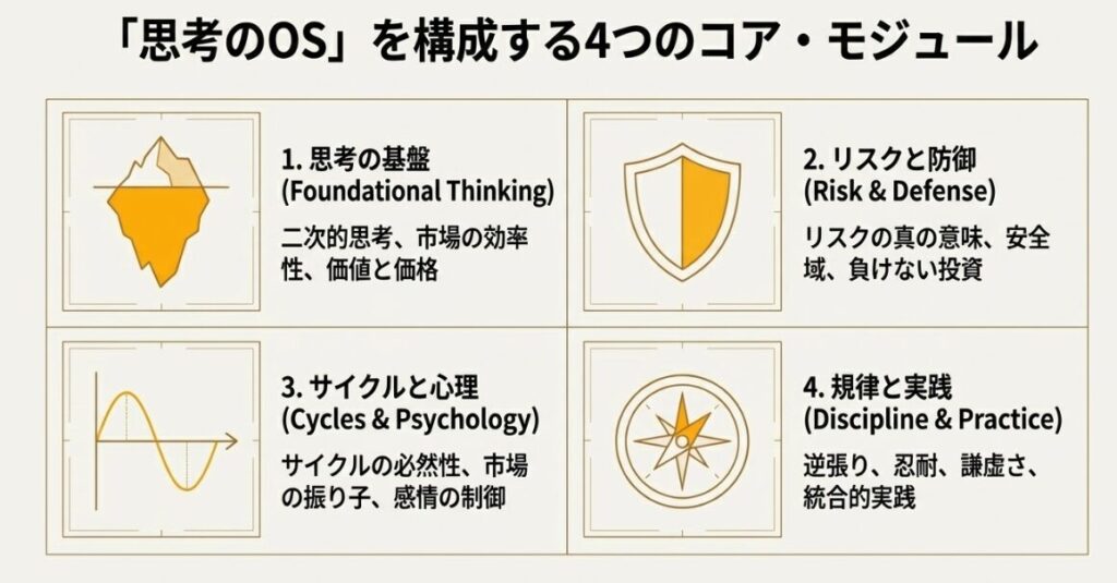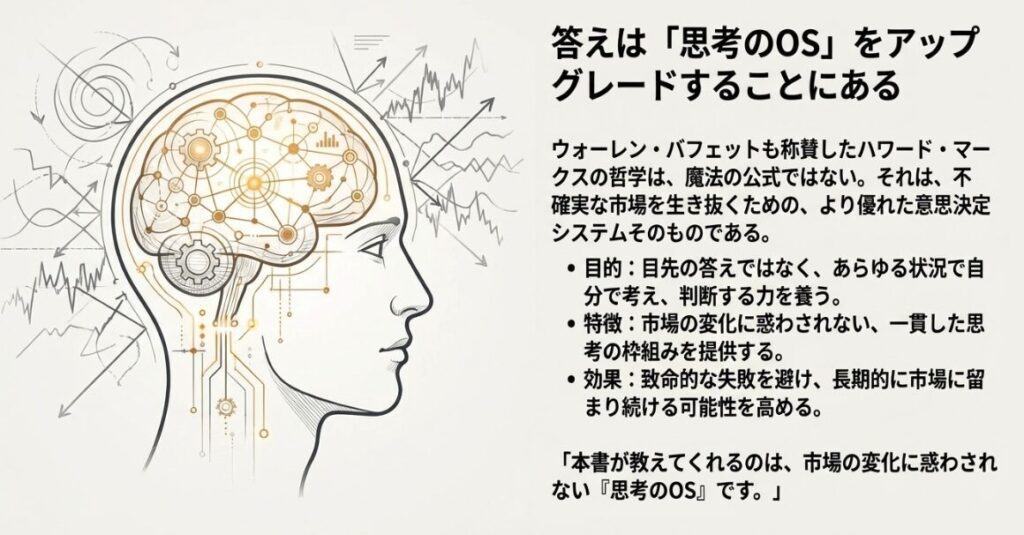 多くの投資本が「どの株を買うべきか」「いつ売るべきか」といった短期的なテクニックを教えるのに対し、本書は違います。本書が教えてくれるのは、市場の変化に惑わされない「思考のOS」です。