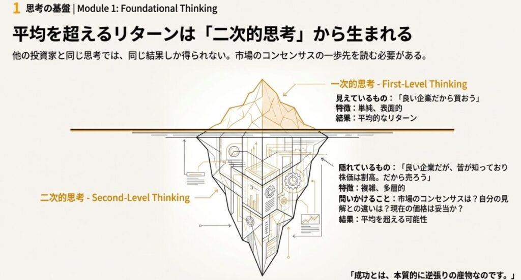 なぜ重要か: 他の投資家と同じ考え方をしていたら、同じ結果しか得られません。平均を超えるには、人と違う思考が必要です。