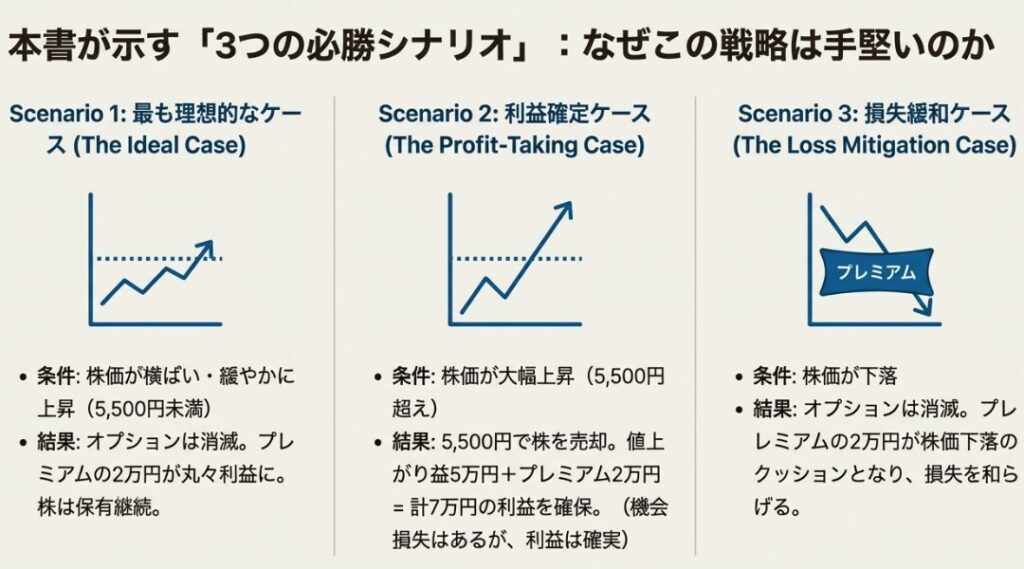 ステップ2:コールオプションを売却 保有する100株を担保として、「3ヶ月後に5,500円でこの株を買う権利」を売る。