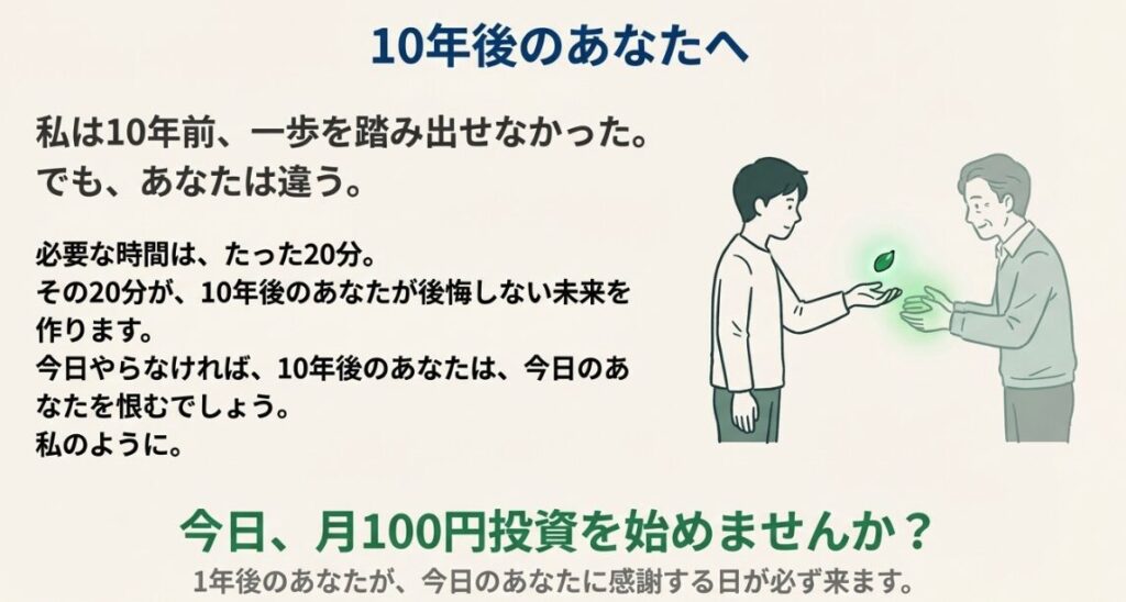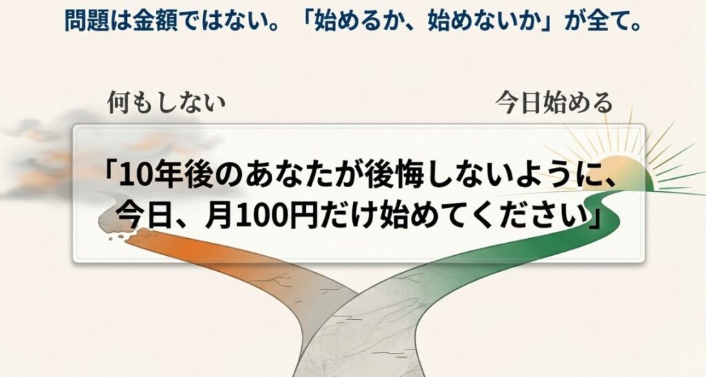 「10年後のあなたが後悔しないように、今日、月100円だけ始めてください」