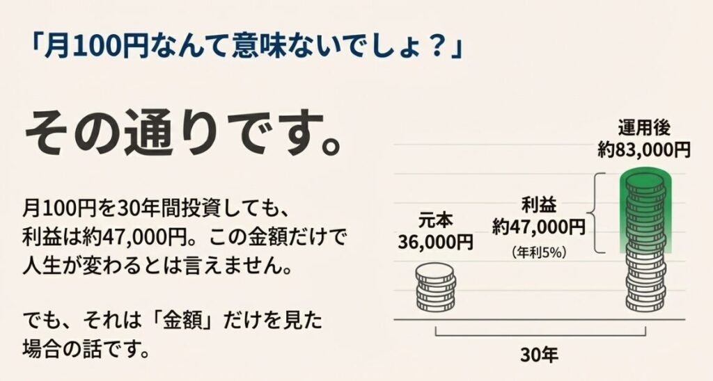月100円を30年間投資しても、利益は約47,000円。この金額だけで人生が変わるとは言えません。