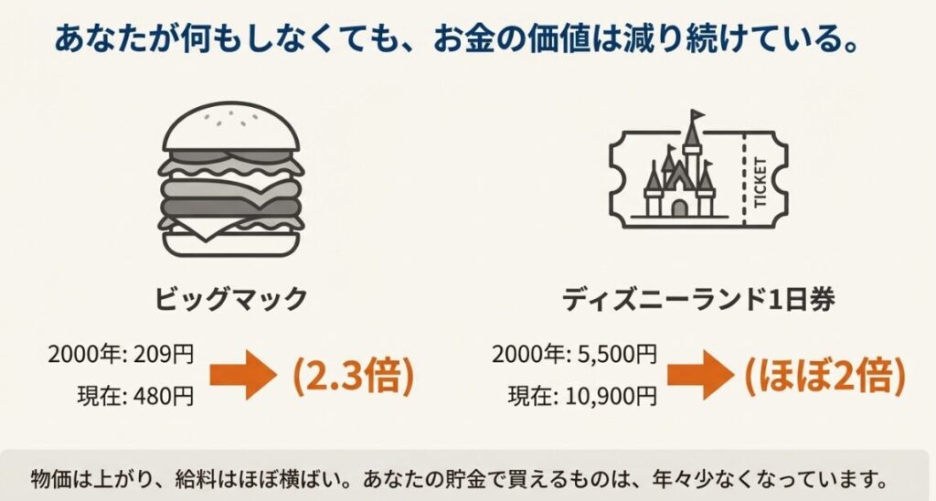物価は上がる。給料は上がらない。貯金の価値は目減りする。