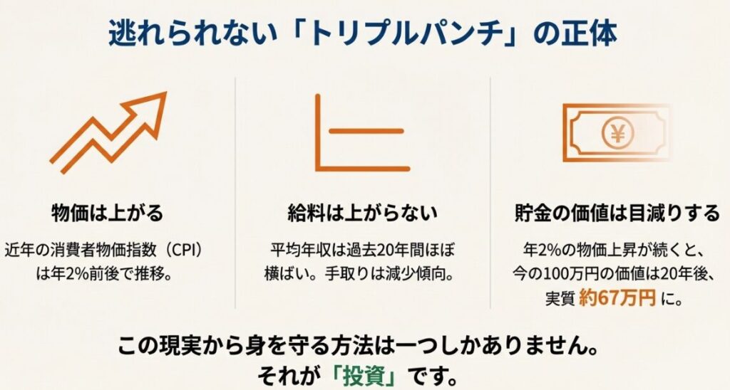 このトリプルパンチから身を守る方法は一つしかありません。それが「投資」です。