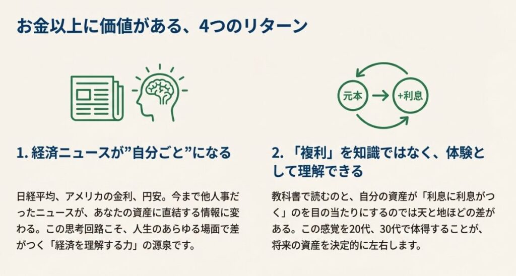 教科書で読むのと、実際に体験するのでは天と地ほどの差があります。月100円でも、自分の資産が「利息に利息がつく」様子を目の当たりにすれば、複利の力を理解できます。