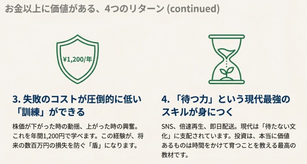 株価が下がったときの心理的動揺、上がったときの興奮と欲、ニュースによる変動の実感、長期保有の精神的な難しさ——これらを年間1,200円という低コストで学べるんです。将来、まとまった資金で投資するとき、この月100円での経験が数十万円、数百万円の損失を防ぐ盾になります。
