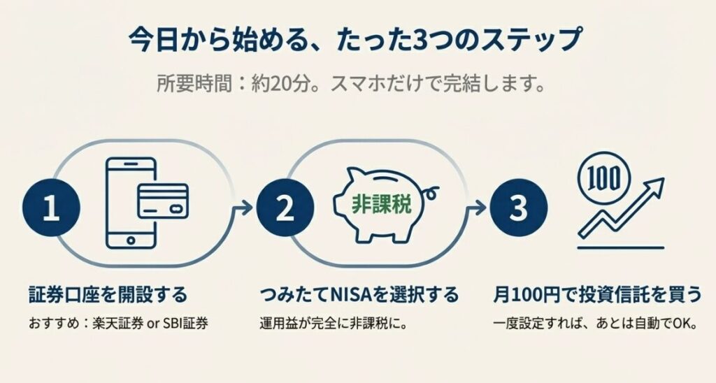この記事を読んでいるということは、あなたは既に「投資に興味がある」という第一歩を踏み出しています。あと必要なのは、証券口座を開設して、月100円の積立設定をするだけ。