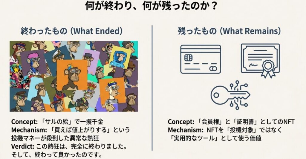 NFTバブルは崩壊しましたが、NFT技術そのものは終わっていません。むしろ、「見えないインフラ」として、私たちの生活に静かに溶け込み始めています。