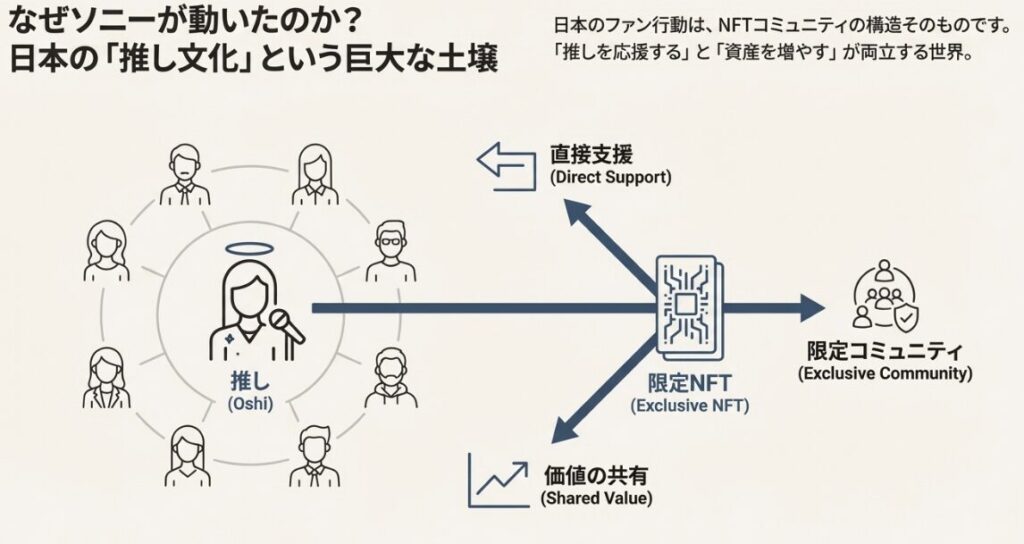 日本人は、好きなアーティストやキャラクターを応援するために、グッズを買い、ライブに通い、SNSで語り合います。この行動様式は、NFTコミュニティの構造そのものです。