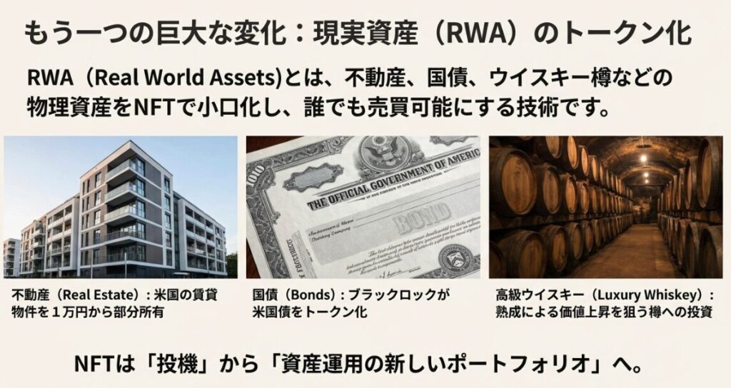 3. もう「サルの絵」じゃない:2025年のNFTは「不動産」と「ウイスキー」