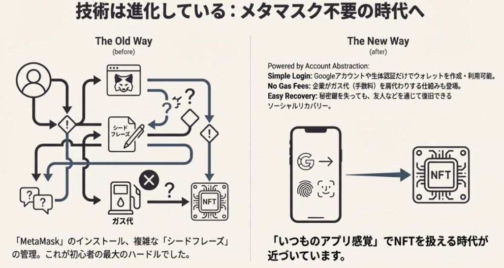 2021年のNFTブームでは、「MetaMask」というウォレットを作り、「シードフレーズ(復元用の12単語)を紙に書いて保管しろ」と言われました。これが初心者の最大のハードルでした。