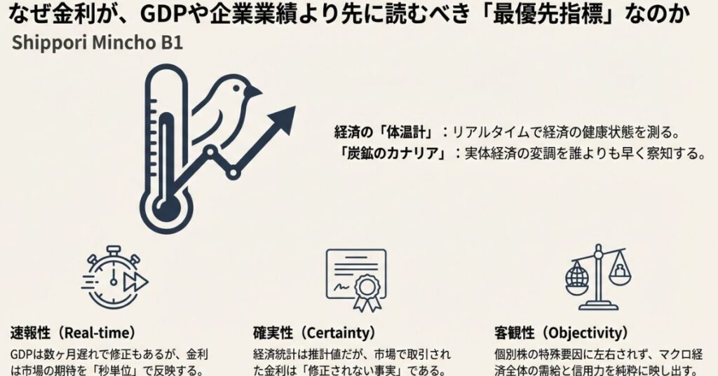 GDP統計は発表まで数ヶ月のタイムラグがあり、後に修正されることも珍しくありません。一方、金利は債券市場で秒単位で形成され、「今この瞬間」の市場参加者の期待を反映します。