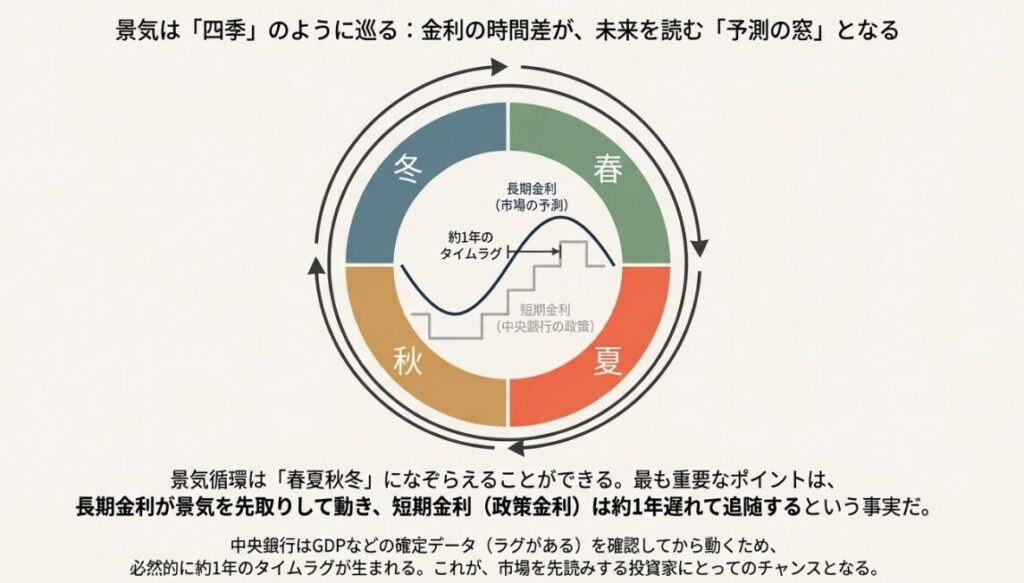 景気循環は春夏秋冬の四季になぞらえられます。重要なポイントは、長期金利が景気を先取りして動き、短期金利(政策金利)は約1年遅れて追随するという時間差です。