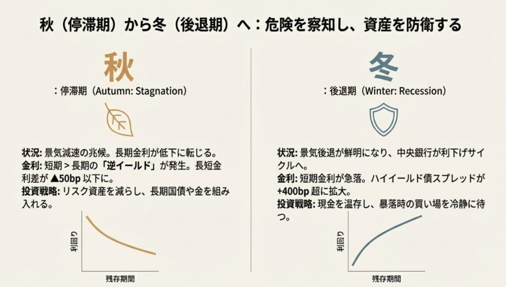 | 冬(後退) | HY債+400bp超 | 20% | 40% | 15% | 25% | 暴落後の買い場を待つ |