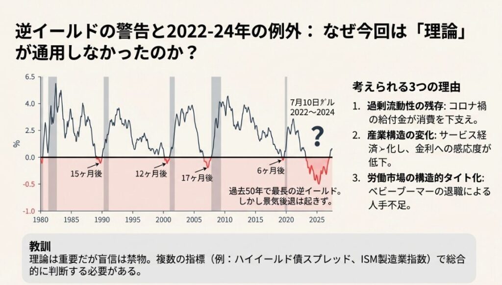 教訓:理論を知ることは重要ですが、盲信せず、リアルタイムの経済指標と信用市場の動きを総合的に判断する必要があります。逆イールドだけで判断するのではなく、ハイイールド債スプレッドやISM製造業指数など、複数の指標を組み合わせることが大切です。