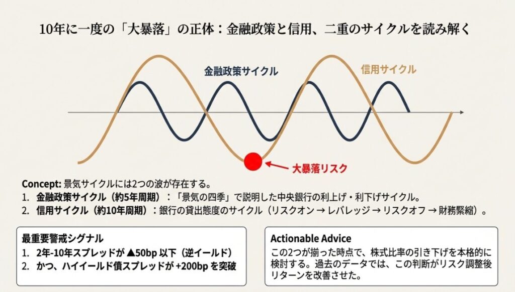 真の投資判断には、5年周期の「金融政策サイクル」と10年周期の「信用サイクル」の重なりを見る必要があります。