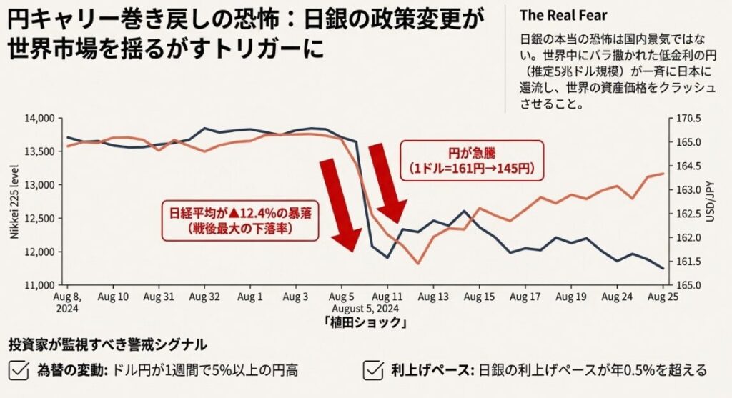 この時、推定5兆ドル規模の円キャリートレードの巻き戻しが発生しました。低金利の円で借りて世界の株式や不動産に投資していた資金が、一斉に円を買い戻す動きとなり、世界市場を揺るがしました。
