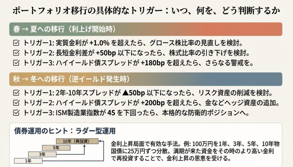 | 夏(加熱) | 長短差+50bp以下 | 40% | 15% | 10% | 35% | 利益確定、レバレッジ解消 |