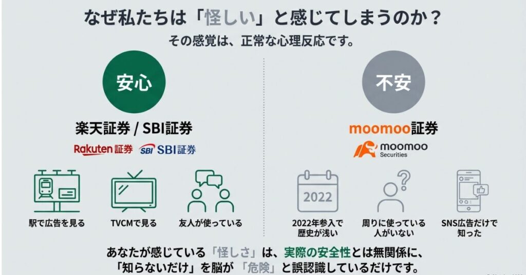 楽天証券やSBI証券を使っている方が、moomoo証券を「怪しい」と感じるのは正常な心理反応です。