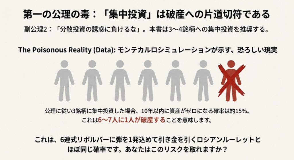つまり、公理に忠実に3銘柄に集中すると、10年以内に6〜7人に1人が破産するのです。