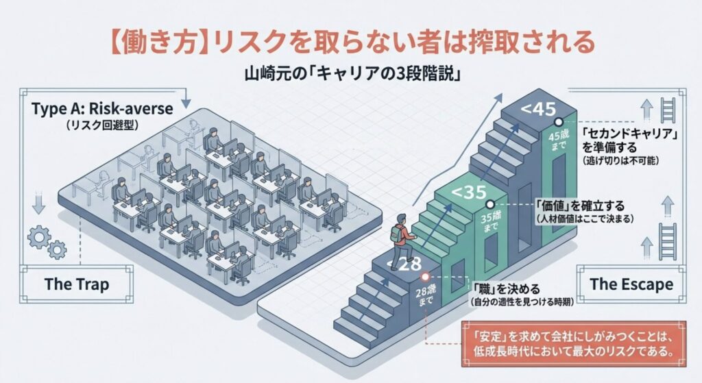 タイプA(搾取される側):リスクゼロを求める安定志向。会社が傾くこと、給料が下がること、降格することを何より恐れる。会社に決められた働き方を好み、結果として取り替え可能な存在になりやすい。