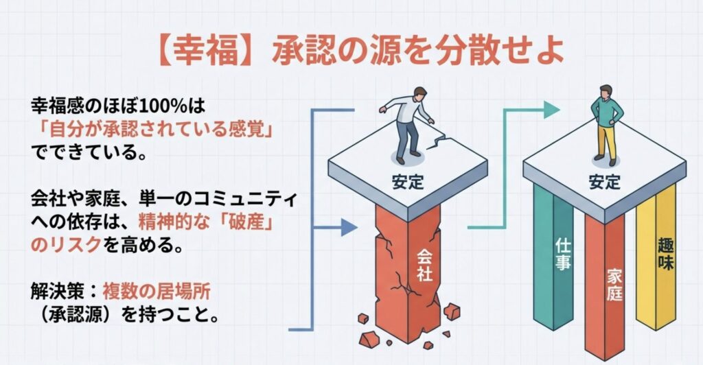 人生には、予期せぬ変化が訪れます。会社の倒産、リストラ、家族との別離、健康の喪失。そのとき、あなたを支えてくれる「承認源」が複数あるかどうかが、あなたの精神的な生存を決めるのです。