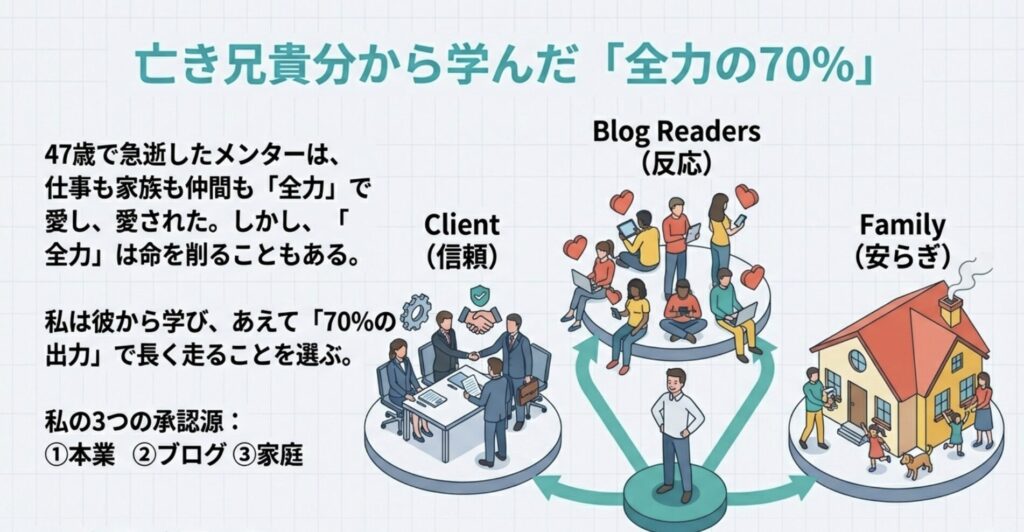 全力の70%で、複数の承認源を持ちながら、長く走れ。それが、47歳で逝った彼から、47歳の私が学んだことだ。