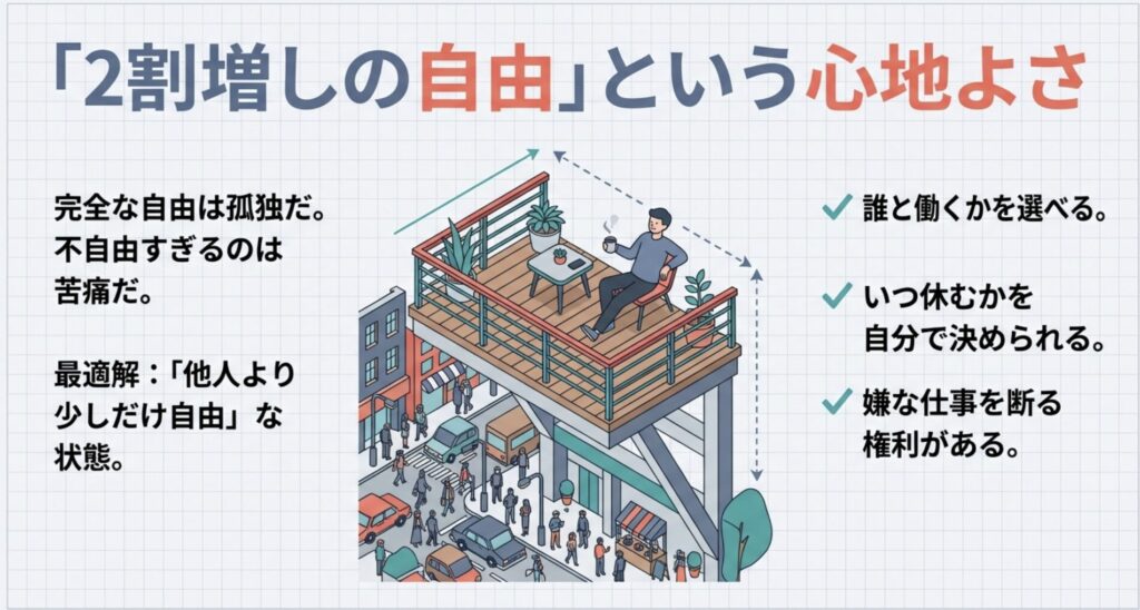 これは、仕事、家庭、趣味といった人生の様々な領域において、「他人より少しだけ自由な状態」を複数組み合わせることが、最も心地よく、幸福度が高い状態であるという考え方です。