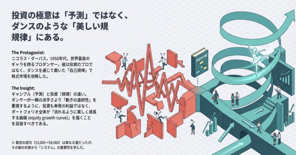 ニコラス・ダーバスは、自身の失敗を隠さず語る誠実な人でした。彼は投資を、ギャンブルから「自己を律する知的なビジネス」へと昇華させました。