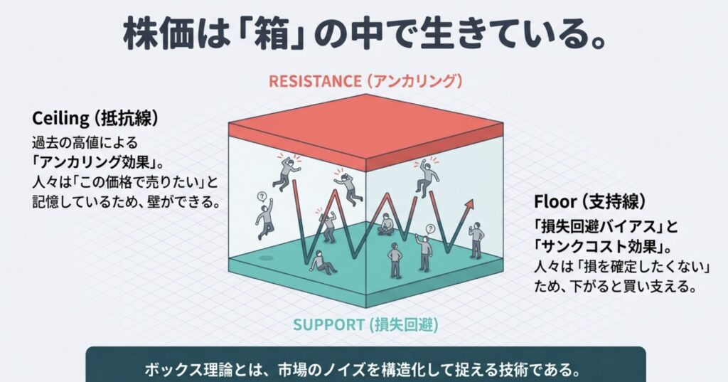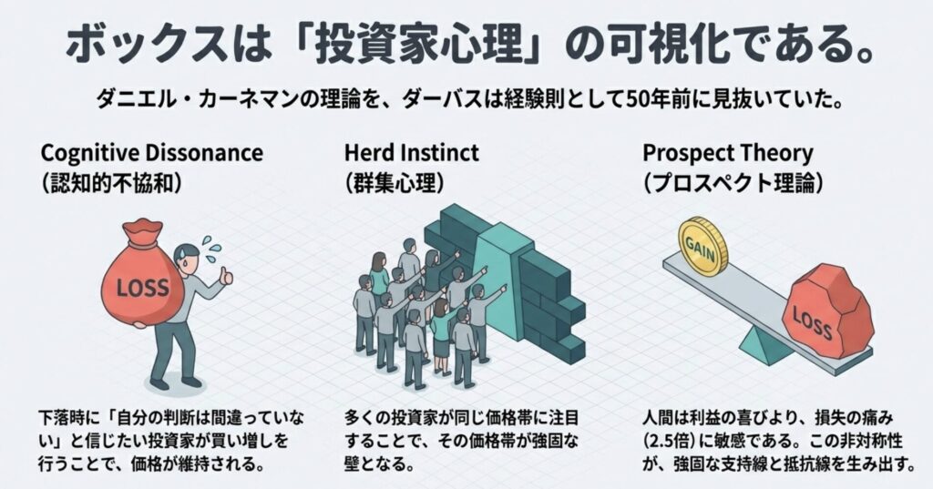 ボックスは単なる図形ではありません。投資家の「集合心理」を可視化したものです。現代の行動経済学が証明した人間の認知バイアスを、ダーバスは経験則として見抜いていました。