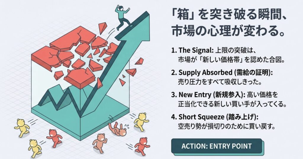 株価がボックスの上限を力強く突破した瞬間、それは市場が新しい価格帯を認めた合図です。この瞬間、投資家心理に重要な変化が起きています。
