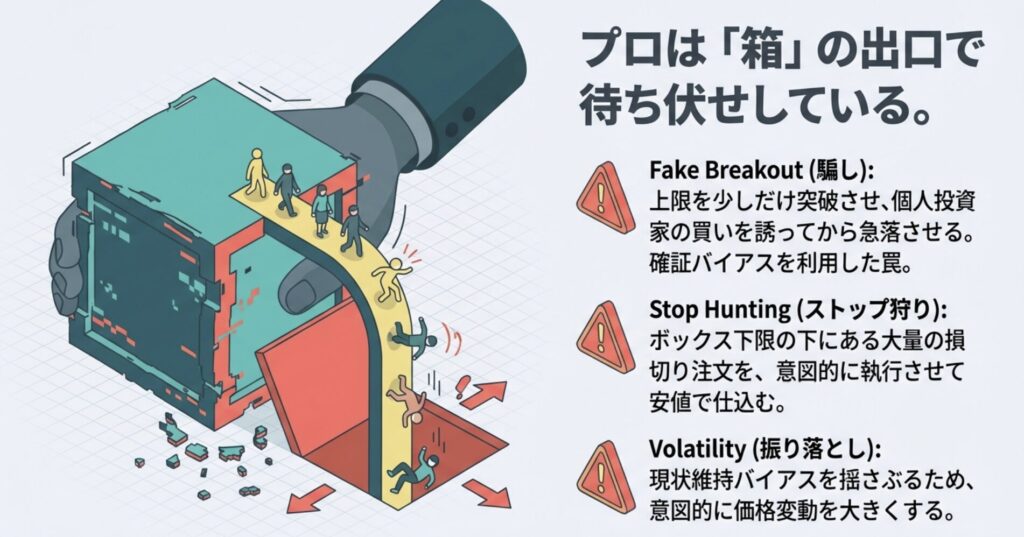 ボックス理論が有名になればなるほど、その裏をかく戦略も洗練されてきました。機関投資家やヘッジファンドは、個人投資家のストップロス注文が集中するポイントを熟知しています。