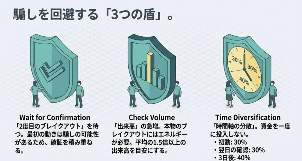 すべての資金を一度に投入するのではなく、ブレイクアウト後の「確認期間」を設けます。初動で30%、翌日の値動きを見て30%、3日後に残りの40%といった段階的なエントリーが、騙しによる損失を最小化します。