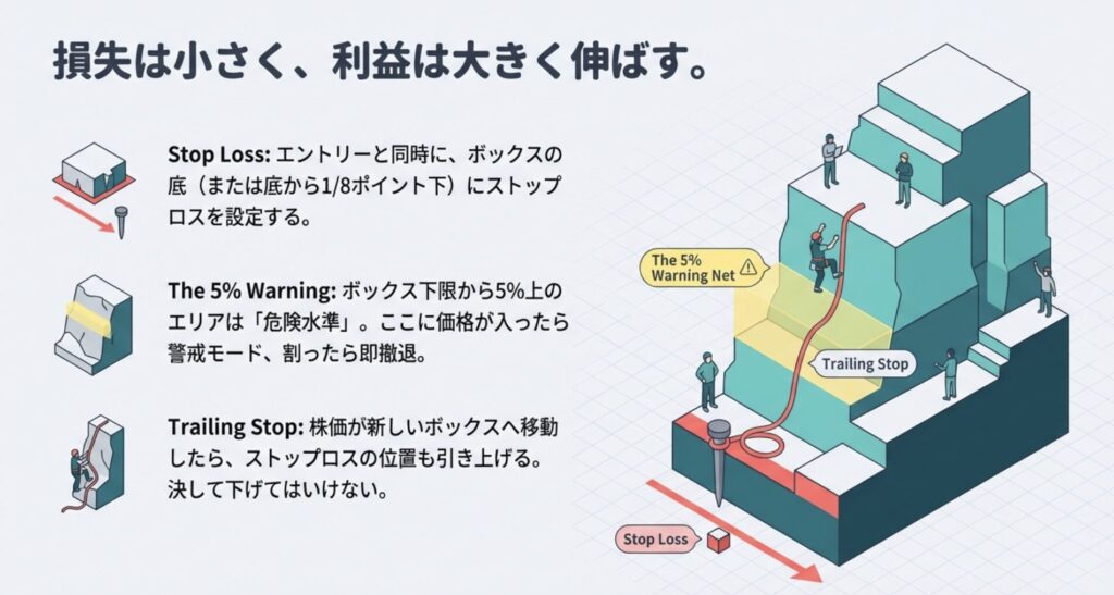 トレーリングストップ: 株価が上のボックスへ移動したら、ストップロスの位置も新しいボックスの下限へと引き上げ、利益を確保しながら伸ばします。