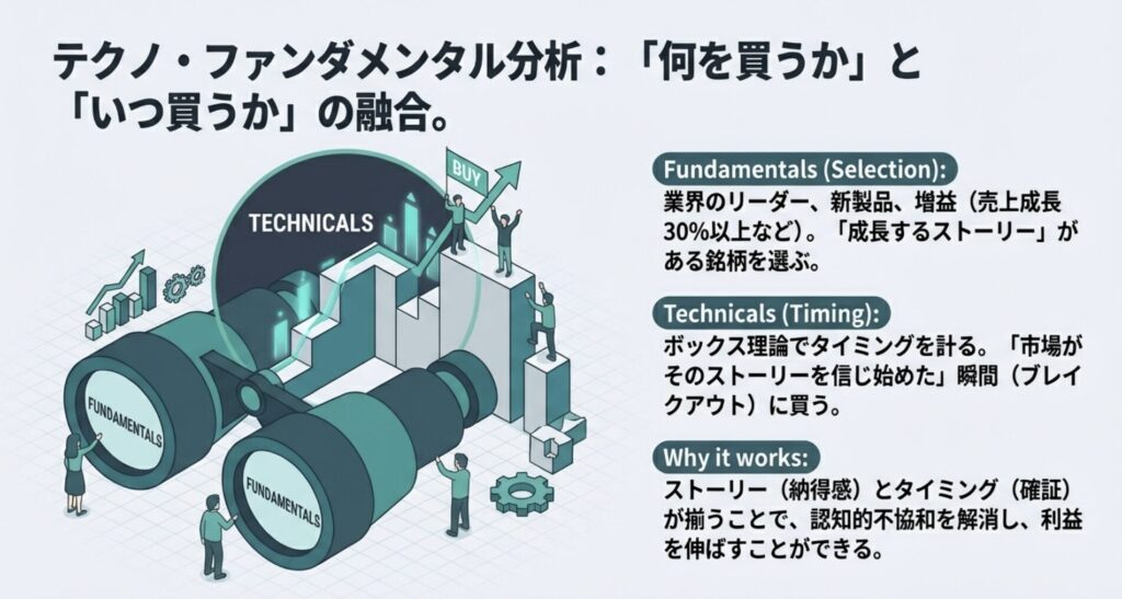 人間の脳は「ストーリー」に弱いという性質があります。優れたファンダメンタルは「この会社は成長する」という納得できるストーリーを提供し、テクニカルは「今、市場がそのストーリーを信じ始めた」という確証を与えます。この二つが揃うことで、認知的不協和(保有し続けることへの不安)が解消され、冷静にポジションを保持できるのです。
