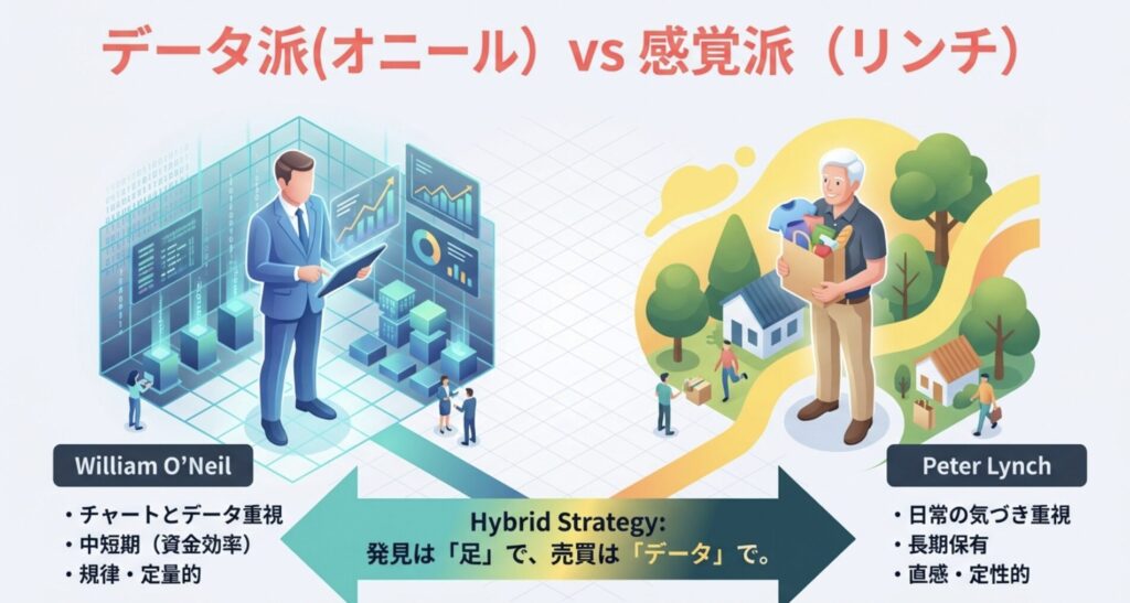 オニールの哲学は、ピーター・リンチの「日常からお宝を探す柔らかい投資術」とは対照的です。リンチが「ショッピングモールを歩け」と説いたのに対し、オニールは「データを読め、チャートを見ろ、そして規律を守れ」と説きます。
