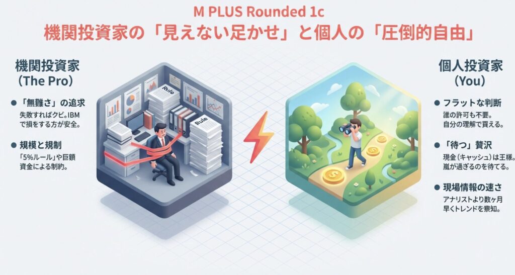 プロは常にフル投資を求められますが、個人は「今は良い株がない」と判断すれば、現金を持って嵐が過ぎるのを待てます。この「待つ力」は、相場が過熱した際の最強の武器です。