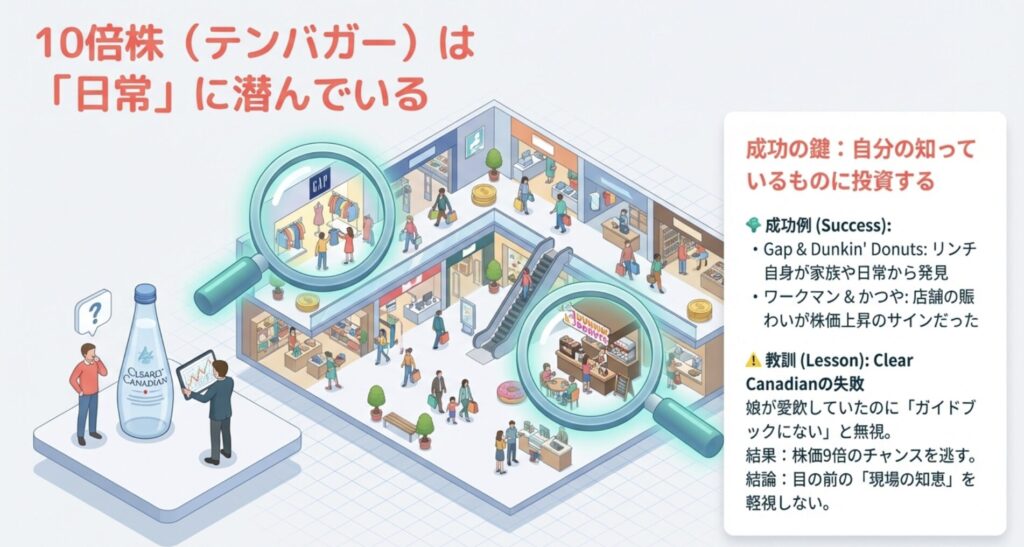 リンチは、株価が10倍に跳ね上がる銘柄を野球のベースになぞらえて「テンバガー」と呼びました。彼自身、娘が好んだ「GAP」や、自身が愛飲した「ダンキンドーナツ」への注目から、大きな成功を収めています。