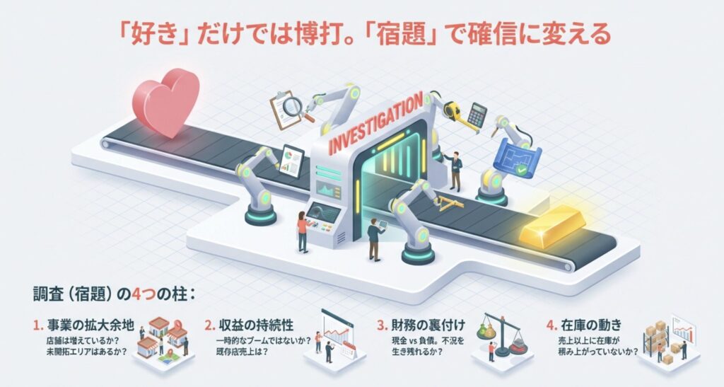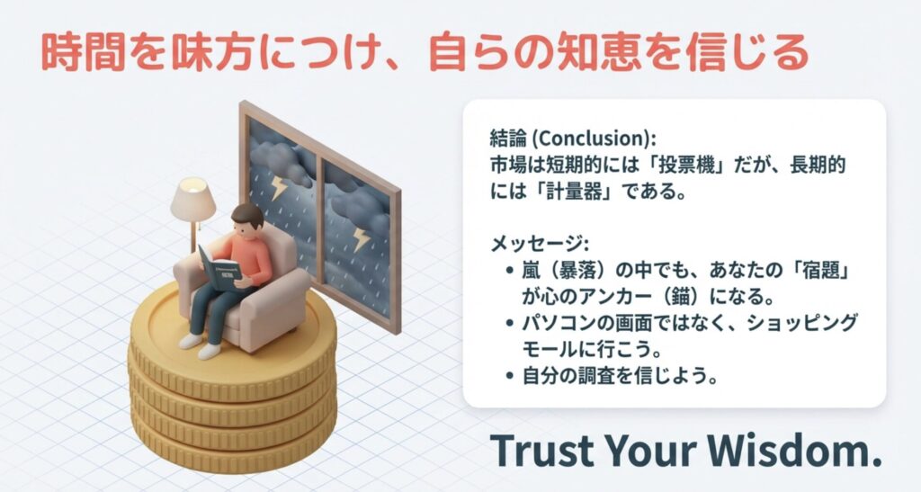 市場が嵐に見舞われた時、あなたを支えるのは、SNSの推奨情報ではありません。あなた自身がショッピングモールを歩き、店舗を観察し、財務諸表を読み解いて積み上げた「確信」だけです。