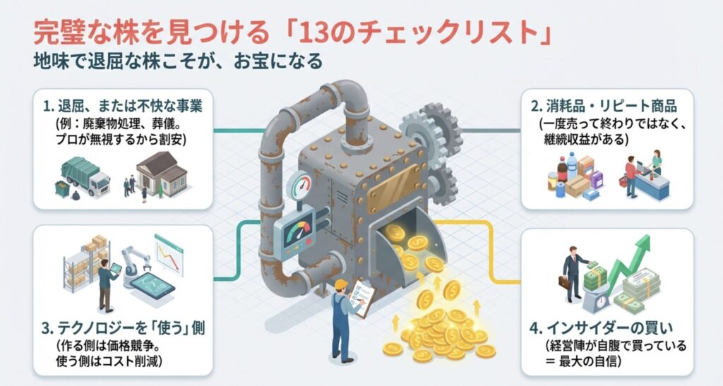 リンチは、華やかな人気株よりも、プロが敬遠するような「地味で退屈な株」にこそ真の価値が宿ると考えました。
