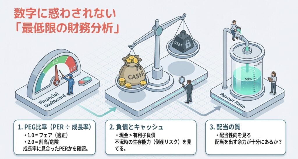 PERが割安か、無謀な買収で財務を悪化させていないかを見ます。