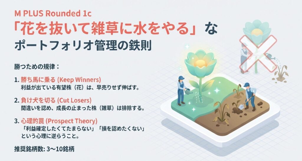 多くの投資家は、少し利益が出た有望株(花)を売り、損が出ているダメな株(雑草)をいつまでも持ち続けます。