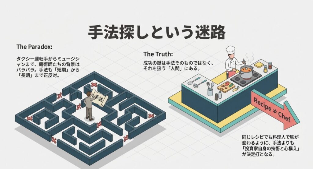 でも、本書に登場する「魔術師」たちを見ていると、面白いことに気づきます。彼らの背景は実に多様なんです。タクシー運転手だったブルース・コブナー、ロックミュージシャンだったアート・コリンズ。使っている手法も、短期売買から長期投資まで、それはもうバラバラです。