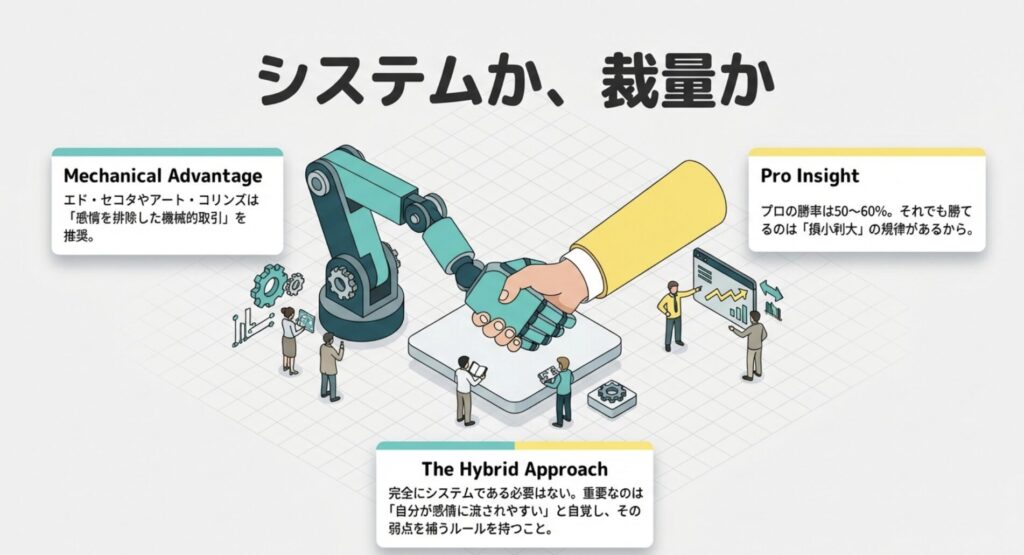 エド・セコタやアート・コリンズは、感情を完全に排除した「メカニカルな取引」の利点を説いています。